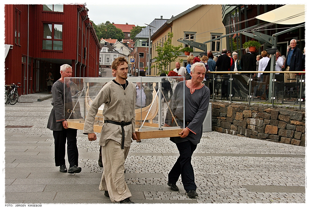Modellen av Osebergskipet bæres ut til byggeplassen. Foto: Jørgen Kirsebom Les mer img_9710