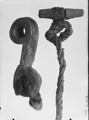 Blokk og knevle fra utgravningene av Osebergskipet. Foto: Kulturhistorisk Museum Les mer blokk og knevle