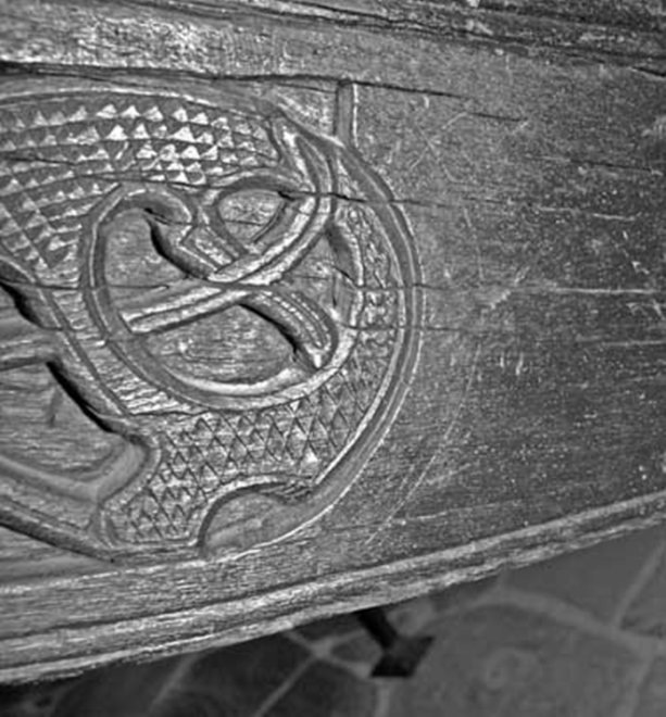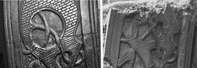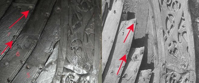 Fig. 29: To bilder av samme område på forstevnen. Bildet til venstre er tatt i Vikingskipshuset…