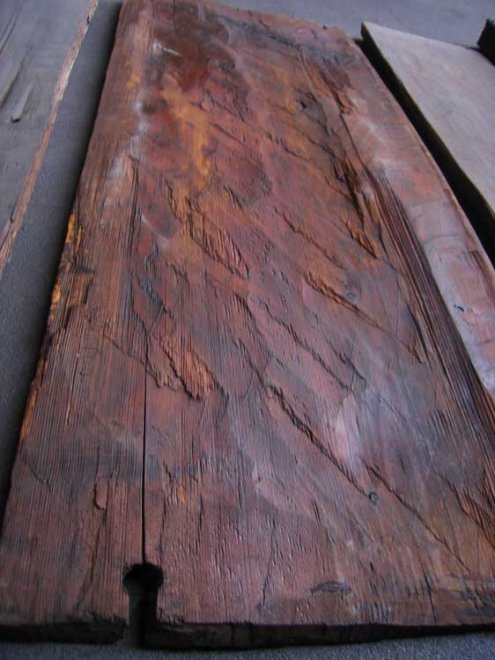 Fig 23: Undersiden av en dørkplanke. Her sees grovt huggearbeid med inntil 15 cm brede huggespor.…