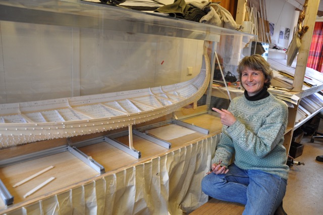 Vibeke Bischoff med modellen av Osebergskipet, laget etter nøyaktige oppmålinger og justert for feil gjort under…