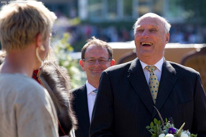 En engasjert Kong Harald i strålende humør på sjøsettingen av saga Oseberg i 2012 Foto: JØRGEN…