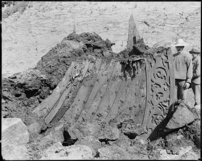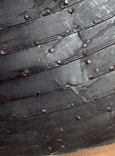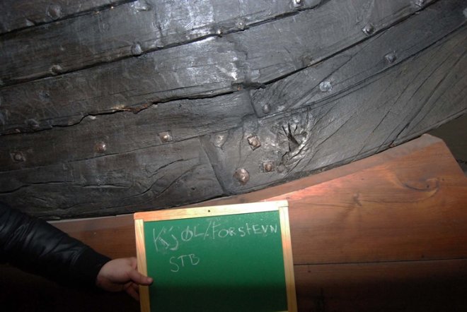 På utgravningsbildene fra 1904 kunne vi se at klinkeskivene i stevnområdet satt utvendig og var rombeformet. Hullene til sømmene var firkantet og ca. 7 mm brede.