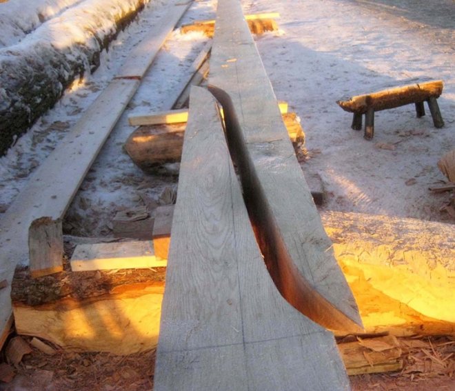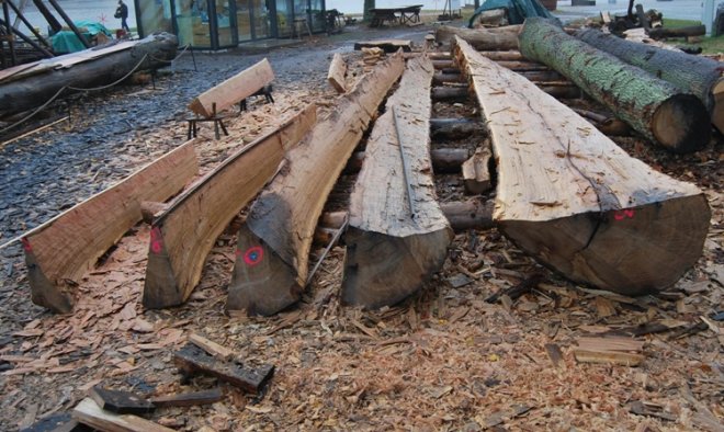 Osebergskipet har et design som presser tre som materiale til det ytterste (fig. 10). Plankene til skipet er laget av rette stammer. De bredeste plankene er 40 cm brede. For å kunne lage en 40 cm bred planke av et kløvet tre kreves en stamme med en diameter på ca. 120 cm i brysthøyde (fig. 11). Bare kavlen, den nederste delen av et slikt tre, veier nærmere 10 tonn.
