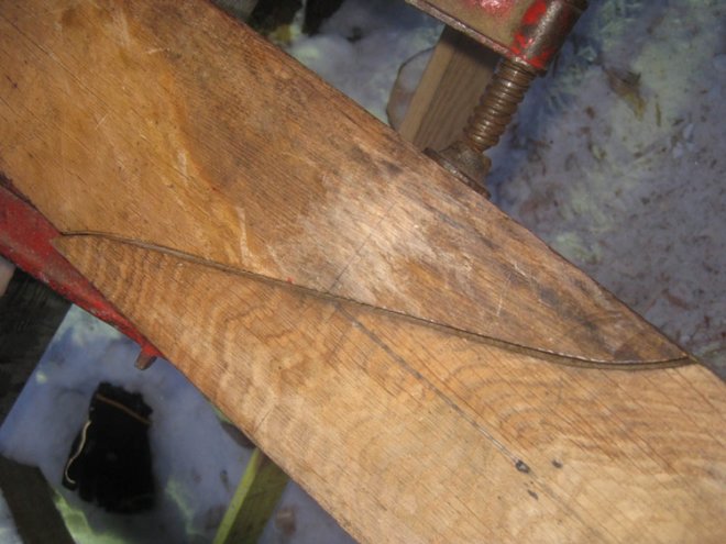 Det første var: Hvordan samlet de stevnene? Det virket umiddelbart logisk. De var samlet med en skrålask slik som det var tegnet. Nærmere undersøkelser av originalen viste også at det var benyttet en skrålask, men en meget spesiell sådan. Flatene var ikke rette, men vridd og S-formet (fig. 20).