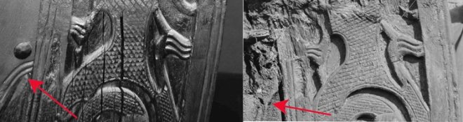 Vi undersøkte derfor hvor mye som var hugget vekk fra originalstykket og kom frem til cirka 7 cm. I den forbindelse gjorde vi enda en oppdagelse. Det viste seg at treskjærerarbeidet på den delen som var hugget bort ikke ble korrekt gjenskapt på den nye delen av stevnen. Man hadde simpelthen funnet på noe nytt.