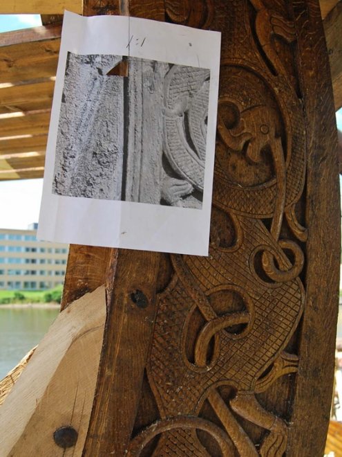 Disse bildene har vi blant annet brukt for å få de små detaljene ved plankenes innløp på stevnene helt riktige. Bildene er blitt forstørret opp i skala 1 : 1. Med disse bildene i hånden har vi kunnet komme svært tett innpå originalen.