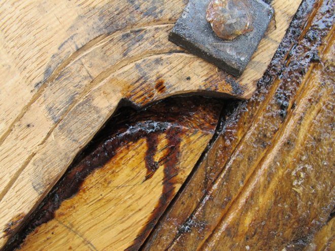Vi fant riktignok ett interessant spor på nederste del av akterstevnen. Her var det tilsynelatende brukt en passer til oppmerking. Hvorfor sto streken igjen? Er arbeidet aldri fullført, eller var oppmerkingen feil?